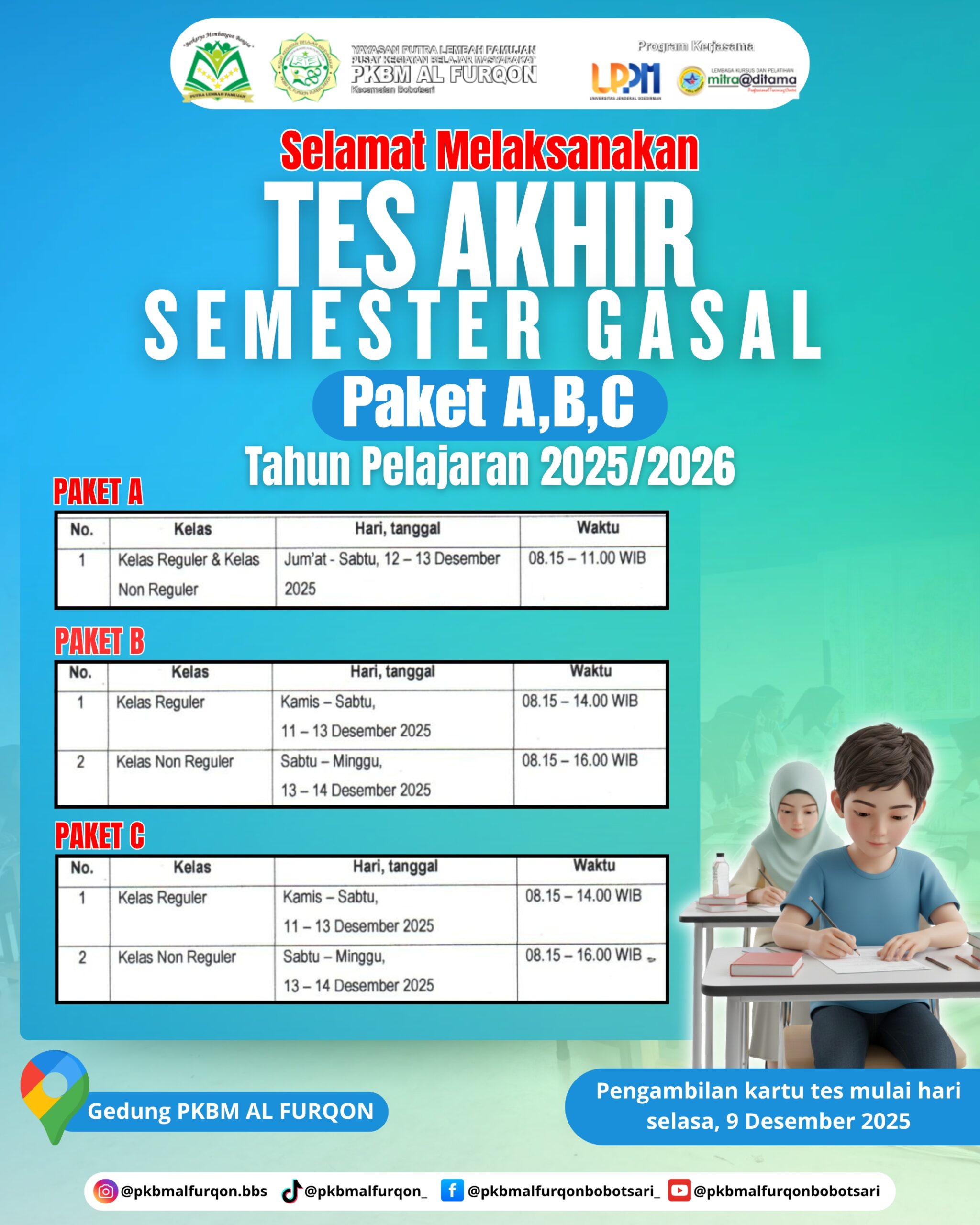 Pemberitahuan Kepada Yth.Warga Belajar Program Paket A, Paket B, dan Paket C PKBM AL FURQON...