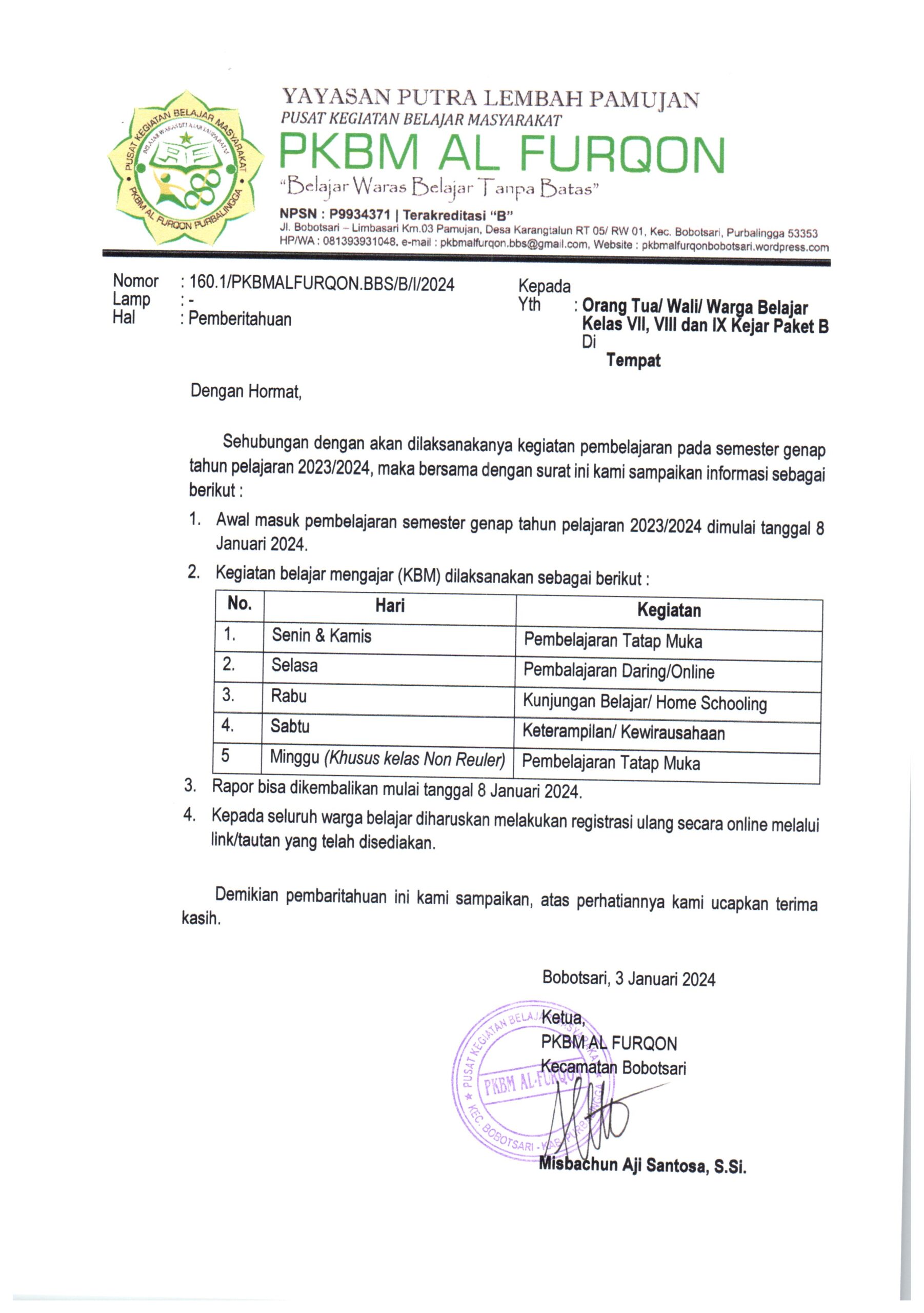 Sehubungan dengan akan dilaksanakanya kegiatan pembelajaran pada semester genap tahun pelajaran 2023/2024, maka bersama dengan ini kami sampaikan informasi sebagai berikut :