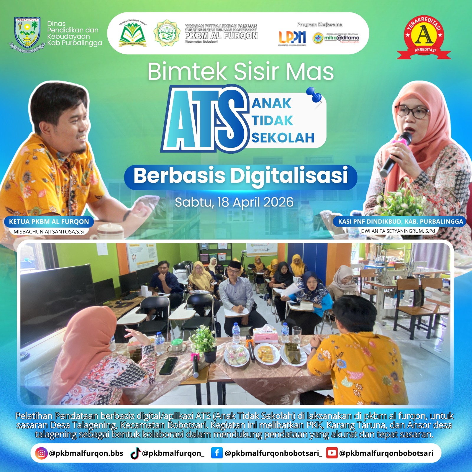 Kegiatan “Sisir Mas ATS (Anak Tidak Sekolah)” berbasis digitalisasi yang diselenggarakan oleh PKBM Al Furqon telah dilaksanakan pada Sabtu, 18 April 2026 di Desa Talagening, Kecamatan Bobotsari. Kegiatan ini melibatkan berbagai unsur masyarakat, di antaranya PKK, Karang Taruna, dan Ansor Desa Talagening.